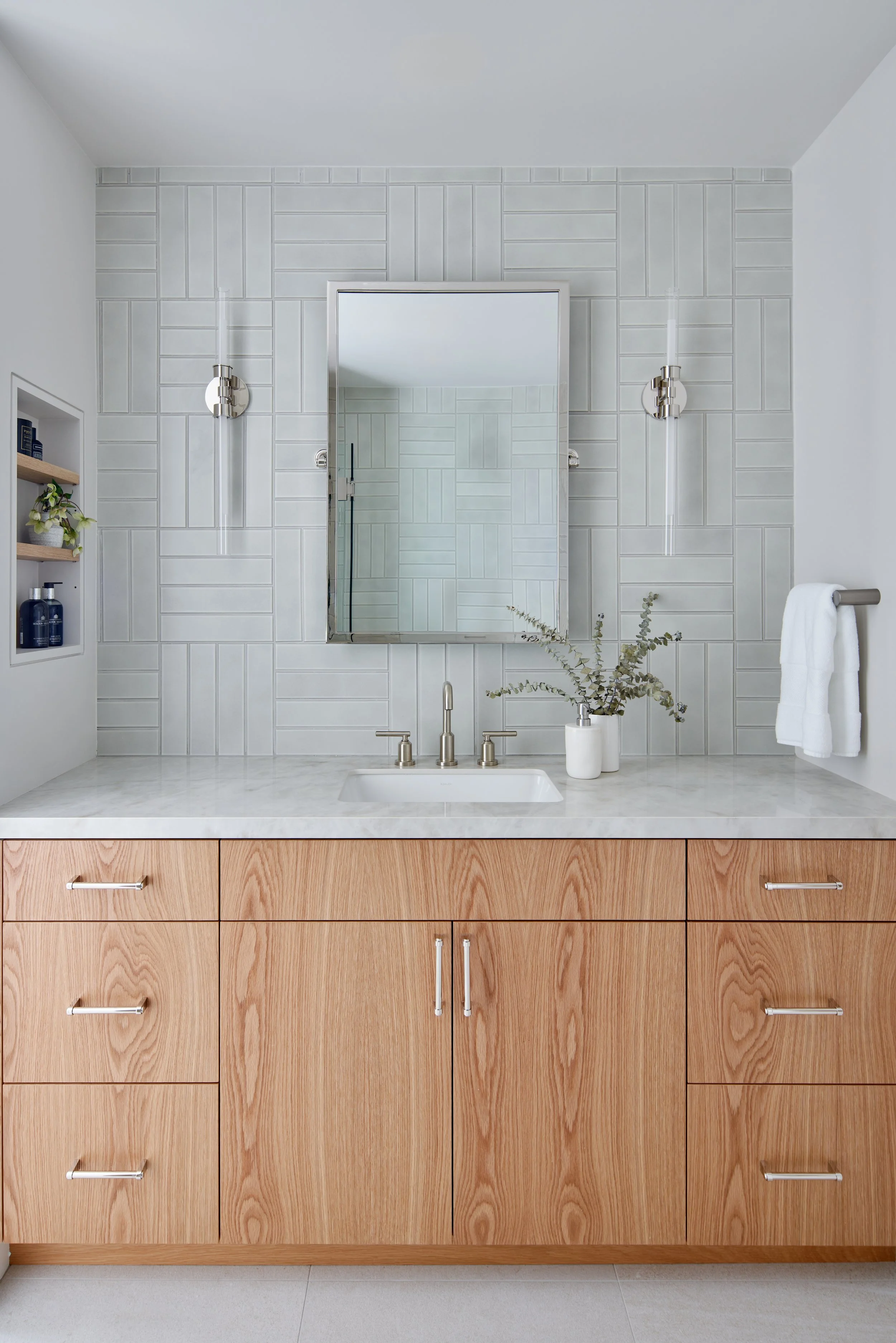 Function was just as important as form. Smart storage, streamlined fixtures, and intentional lighting make the daily routine feel seamless, while subtle design moments—like a statement vanity and perfectly scaled tile—add just enough personality to make the spaces memorable.